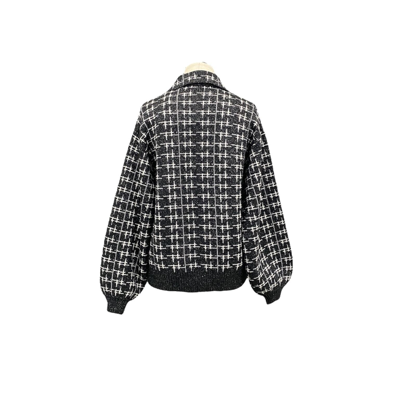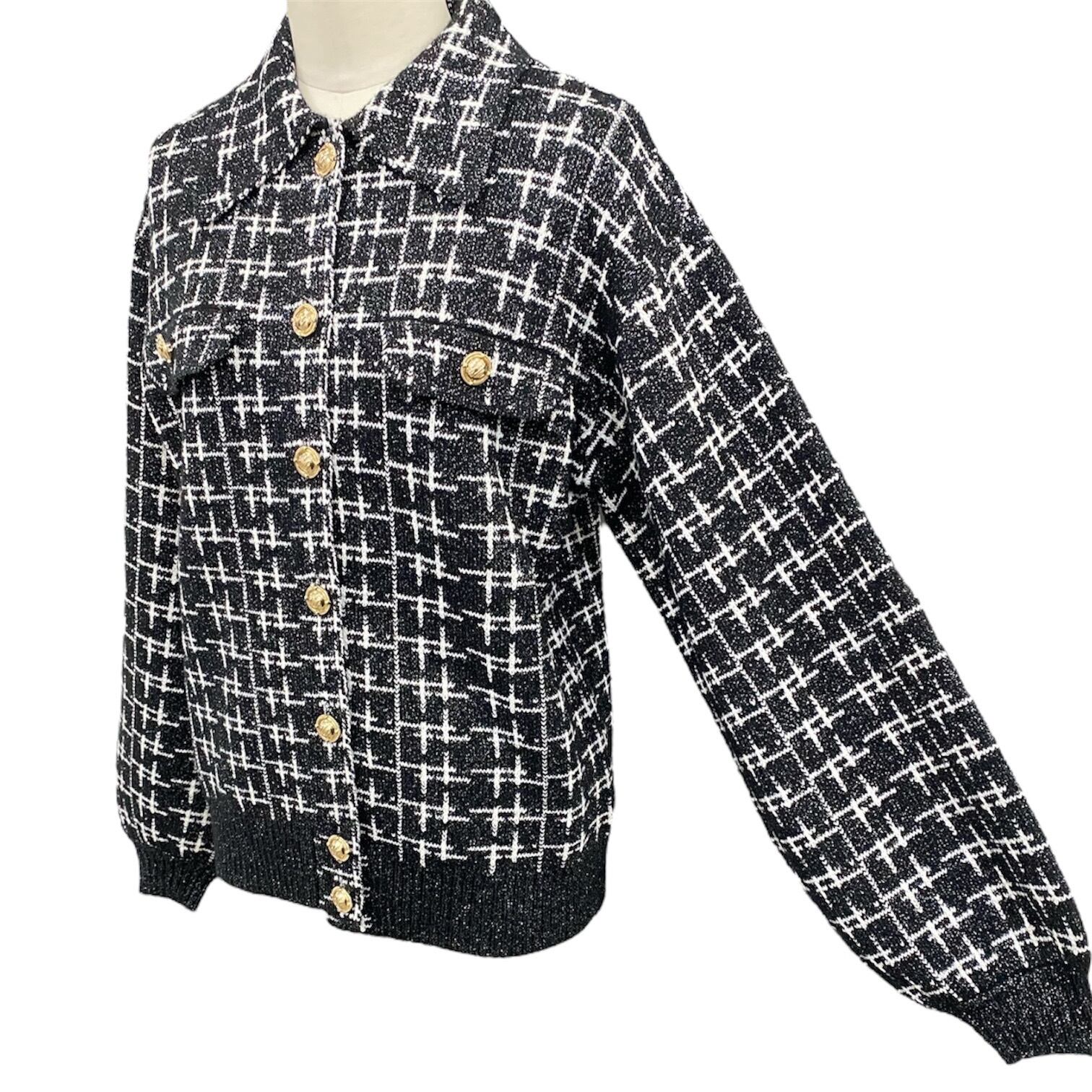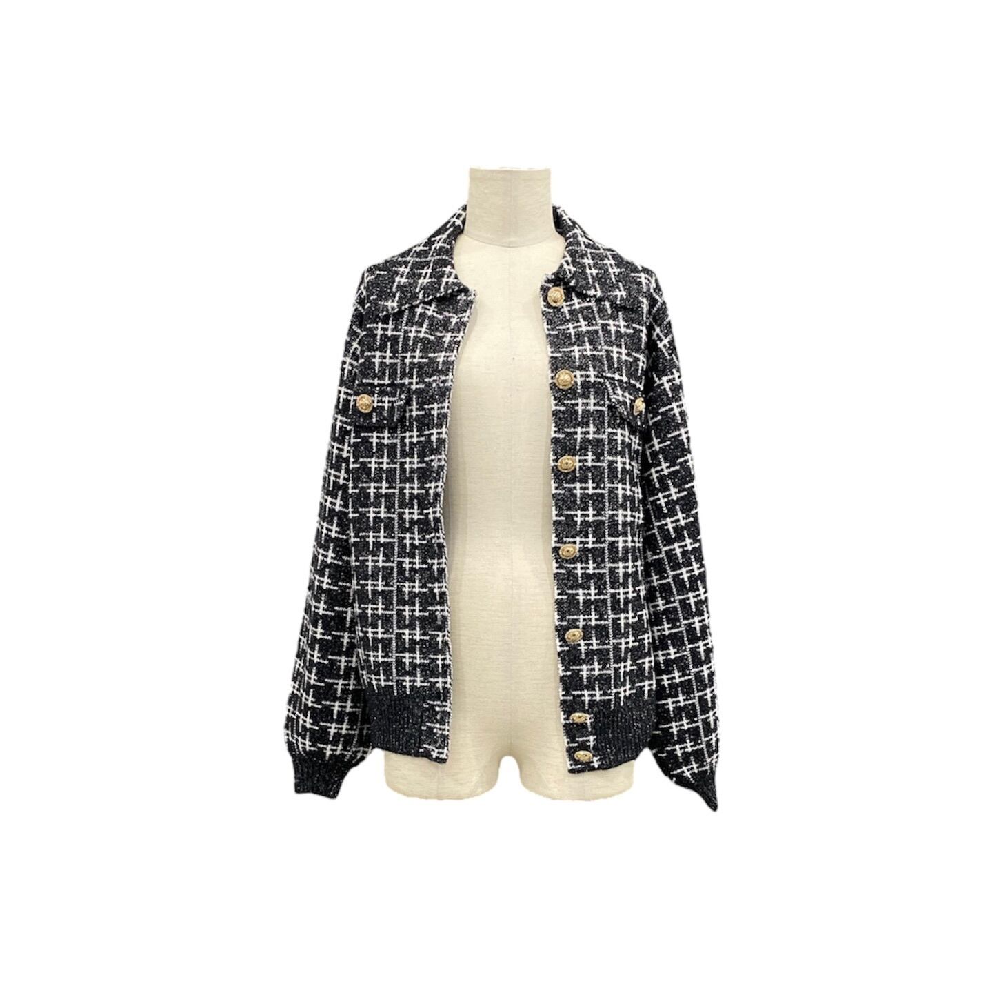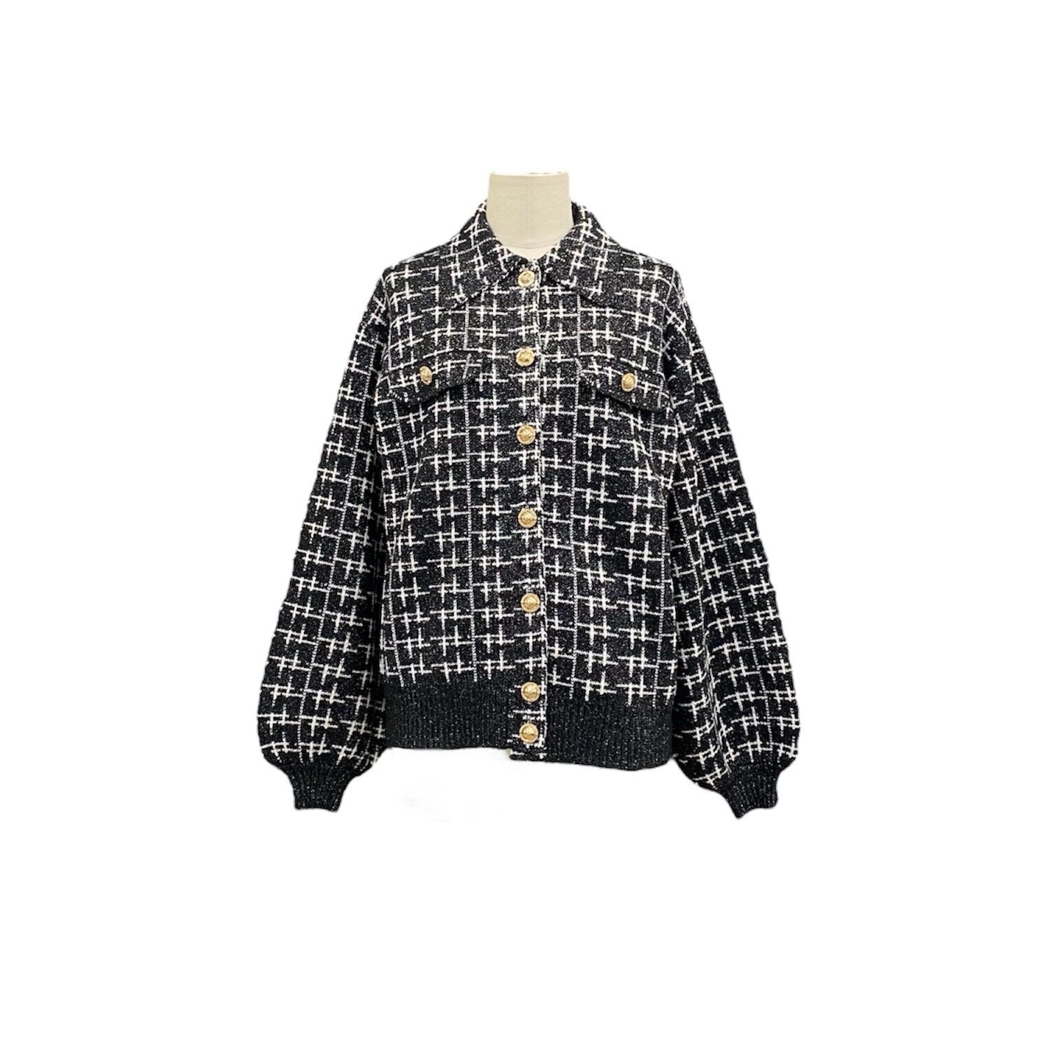 ピカピカの金ボタンがポイントのツィードライクなニット