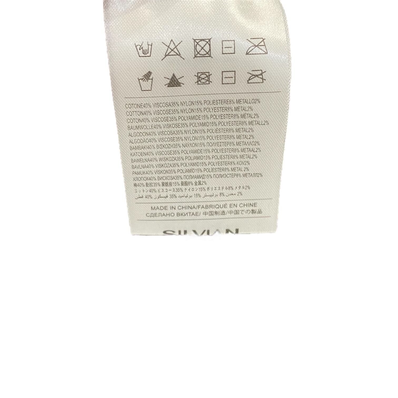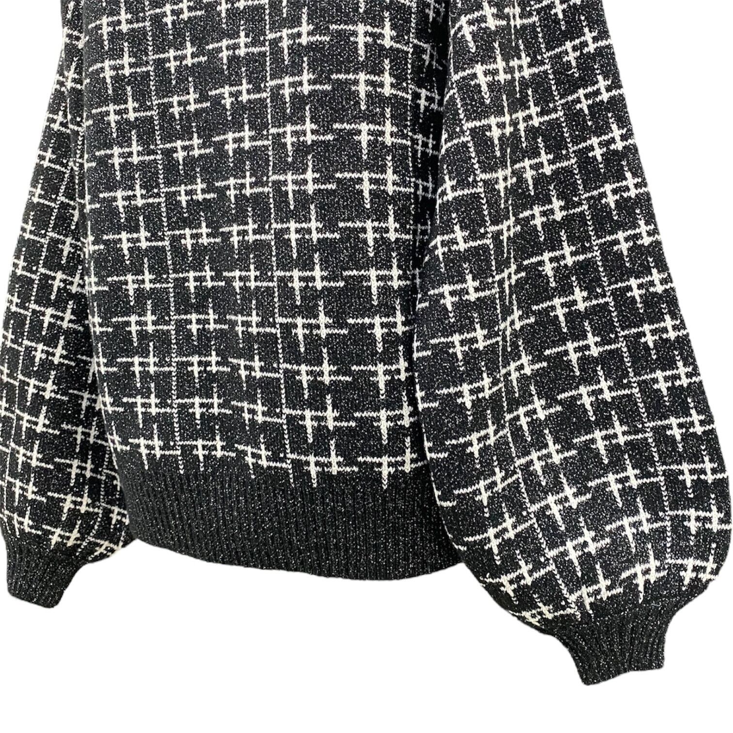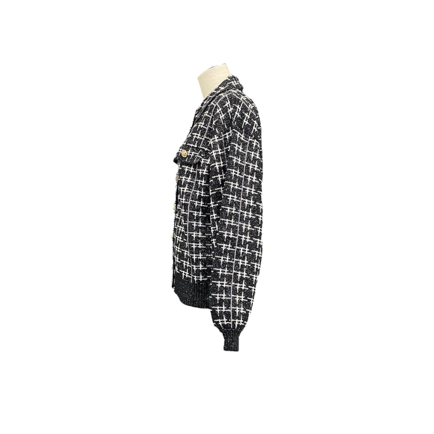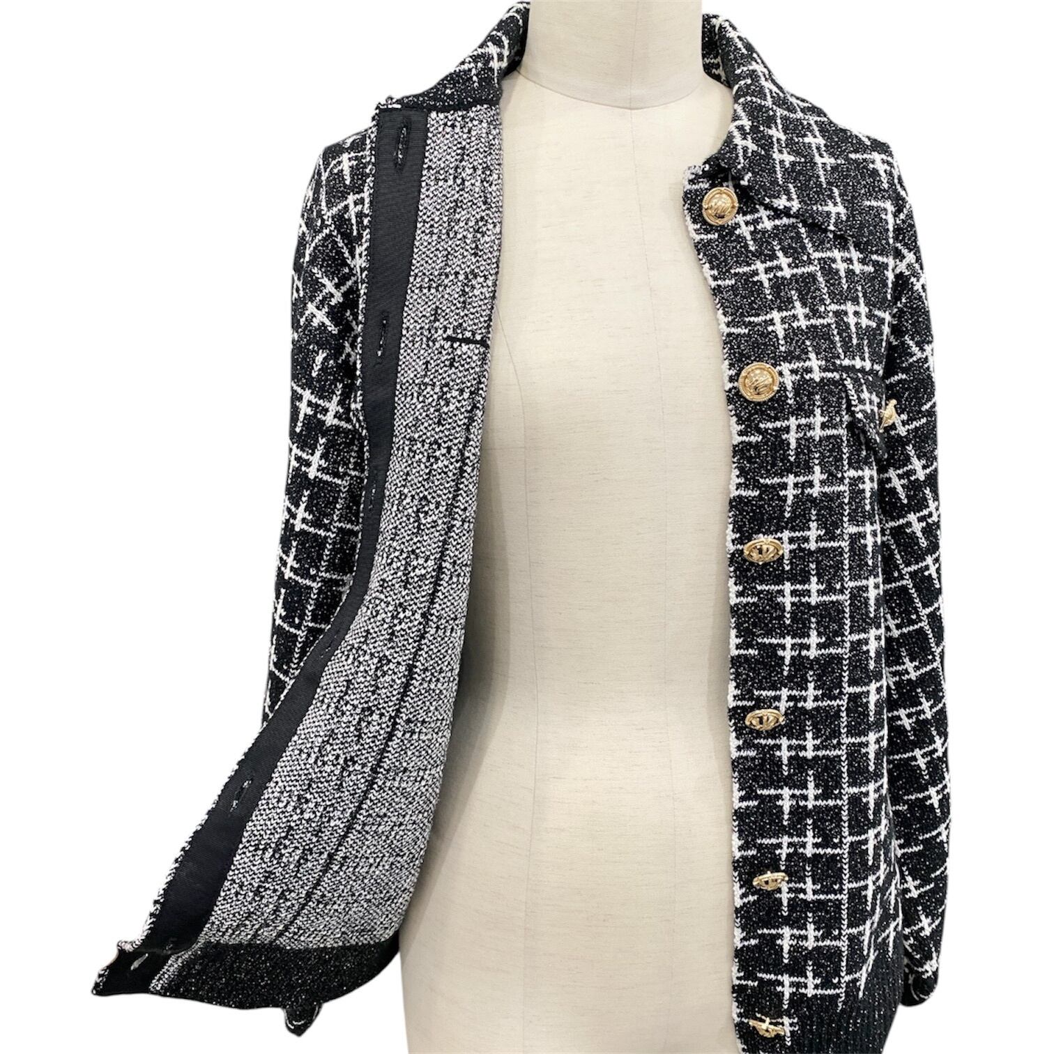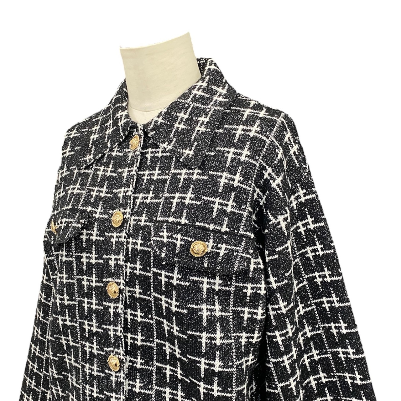 ピカピカの金ボタンがポイントのツィードライクなニット