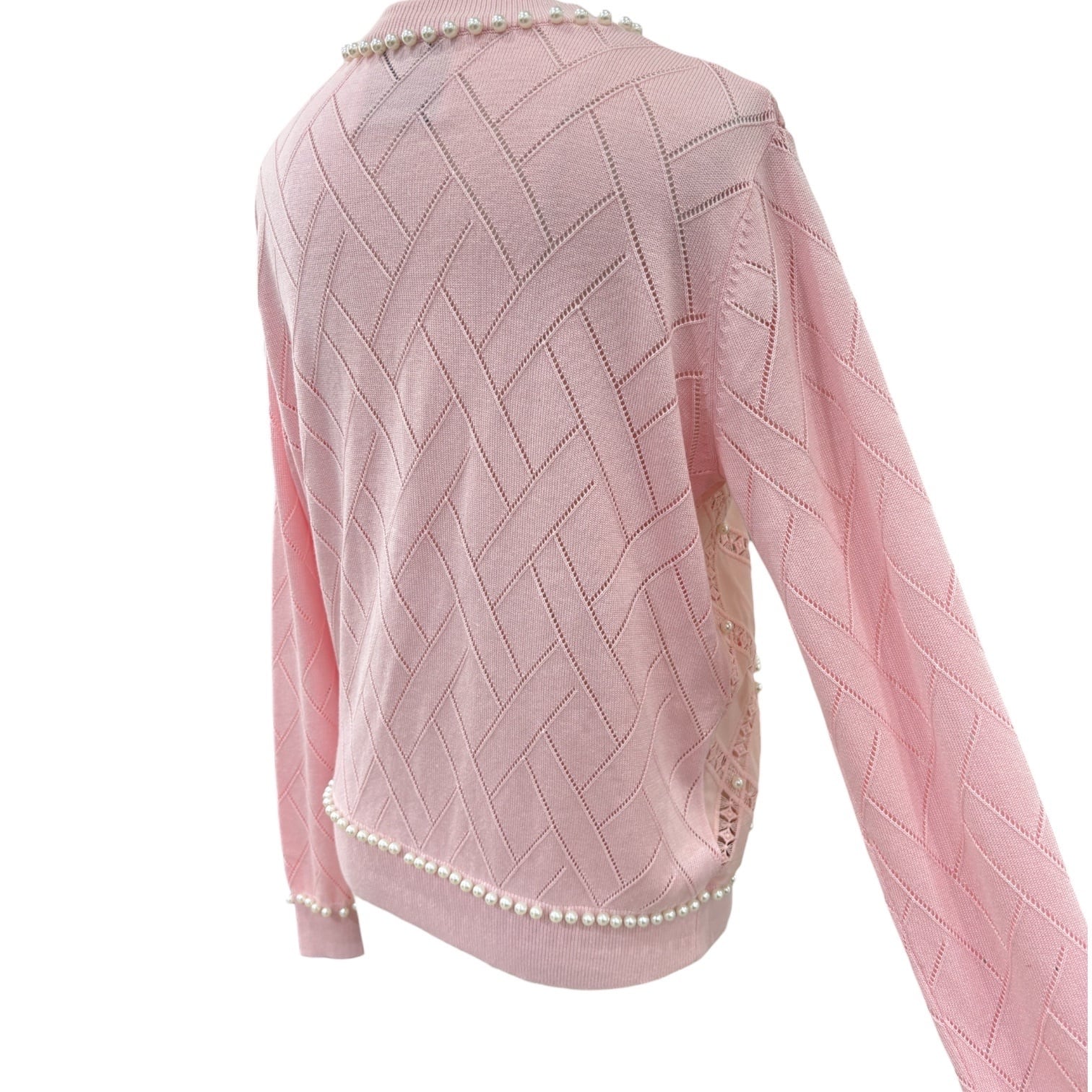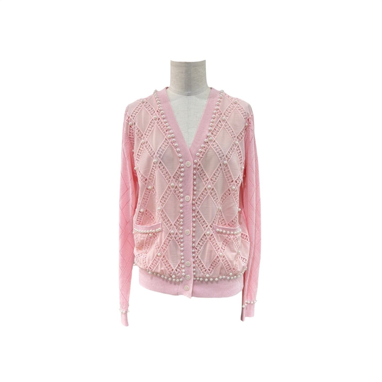 透かしレースでダイヤ柄になったに前身頃にパールがアクセントになったカーディガン