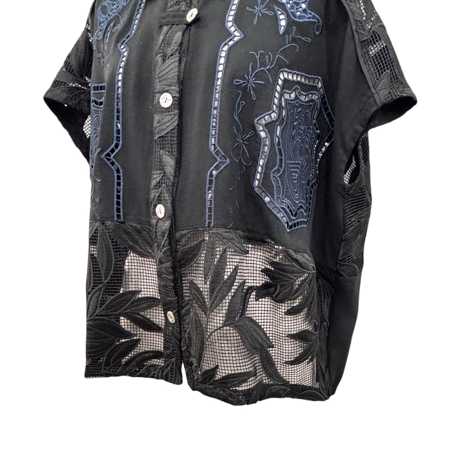 カットワーク刺繍とリーフ柄のメッシュ素材のコンビネーションデザインのシャツ